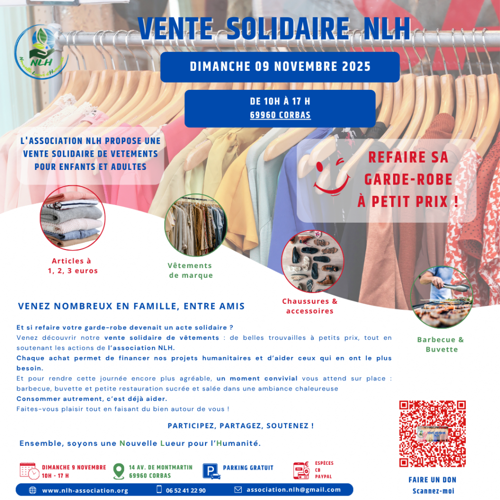 Venez découvrir notre vente solidaire de vêtements : de belles trouvailles à petits prix, tout en soutenant les actions de l’association NLH.
