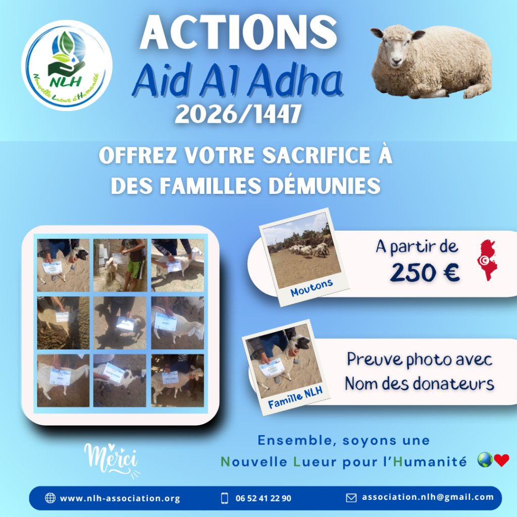 Vous pouvez dès à présent nous confier la réservation de votre sacrifice qui sera distribué auprès des plus démunies en Tunisie.